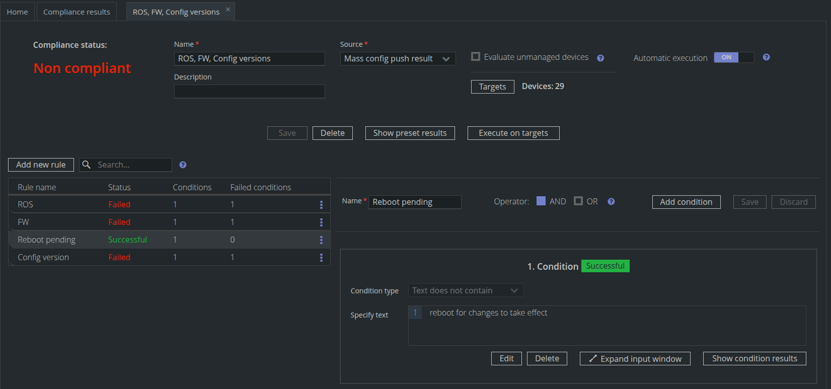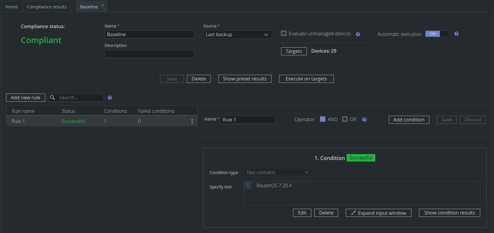 Next, create a Compliance preset, enable Automatic execution, and select “Mass Config Push result” as its source, targeting your preconfigured MCP preset. Then define the rules and conditions that will evaluate the collected device output using text or regex matching. After each MCP run, the engine analyzes the latest runtime output from your devices and checks it against your Compliance rules.
