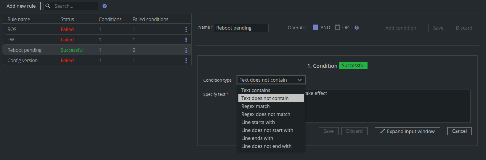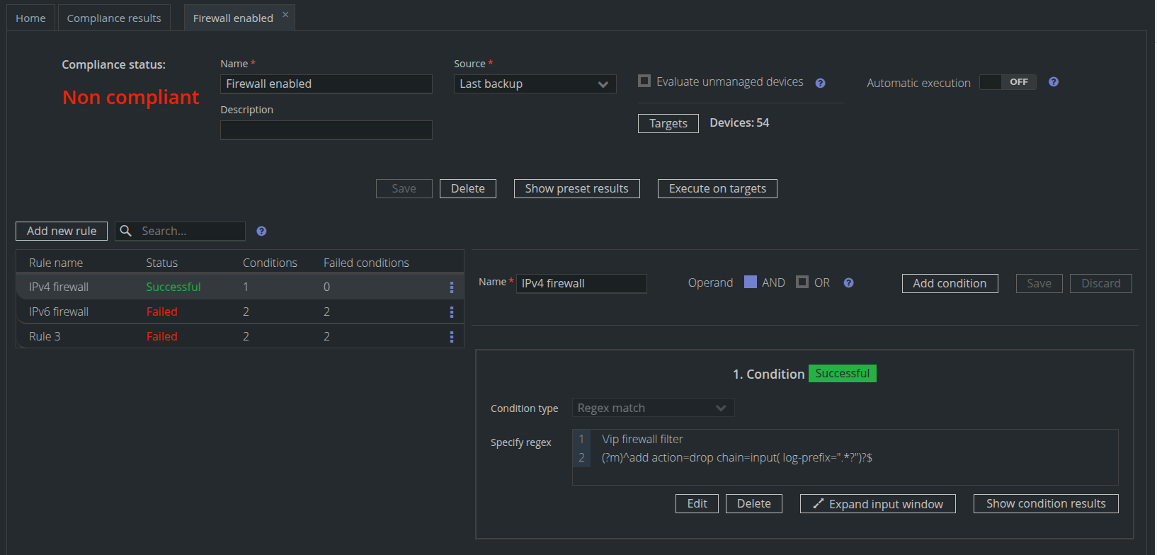In addition to golden configuration presets, the Compliance engine lets you define flexible conditions using regular expressions, giving precise control over which configuration elements are allowed or disallowed on each device.