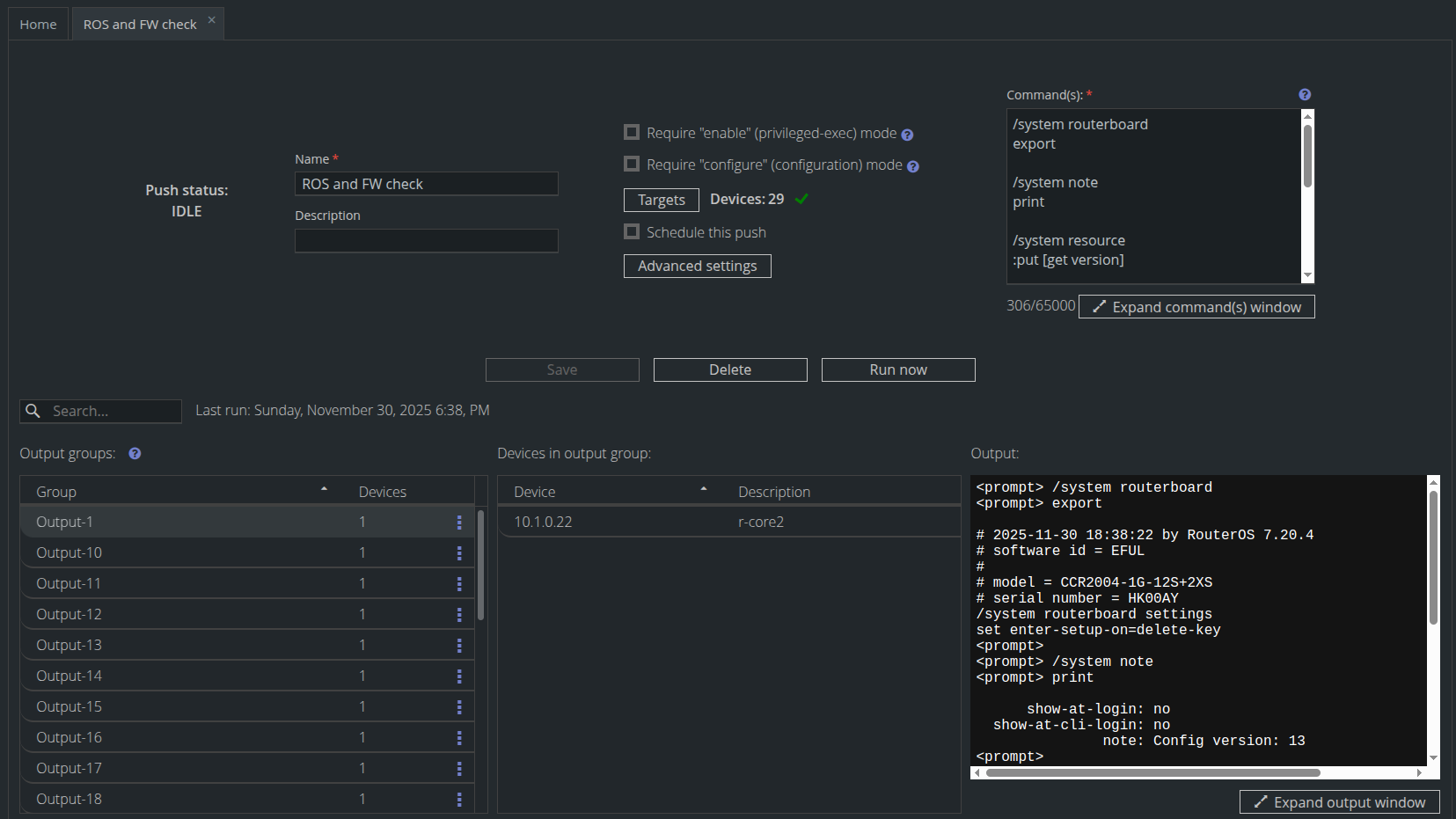 Start by creating and scheduling a Mass Config Push preset targeting the devices whose runtime state you want to inspect. Even tho the feature in Unimus is called "Mass Config Push", we will use it to Pull data from devices in this case. The MCP preset should include the appropriate show commands that query the devices’ operating state.