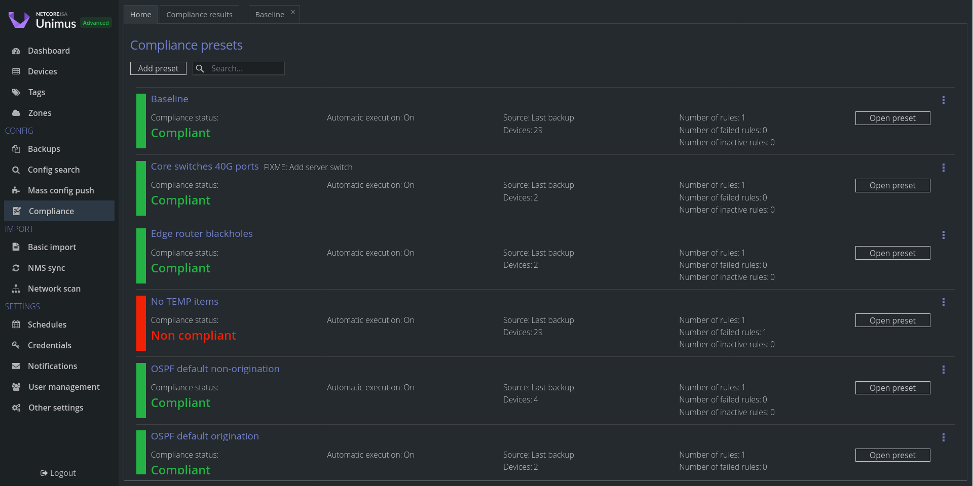 With the preset in place, Unimus will continually review your latest configuration backups and flag any devices that drift from the baseline. No more combing through massive configs across hundreds of devices — the Compliance engine takes over, quietly keeping everything in check.